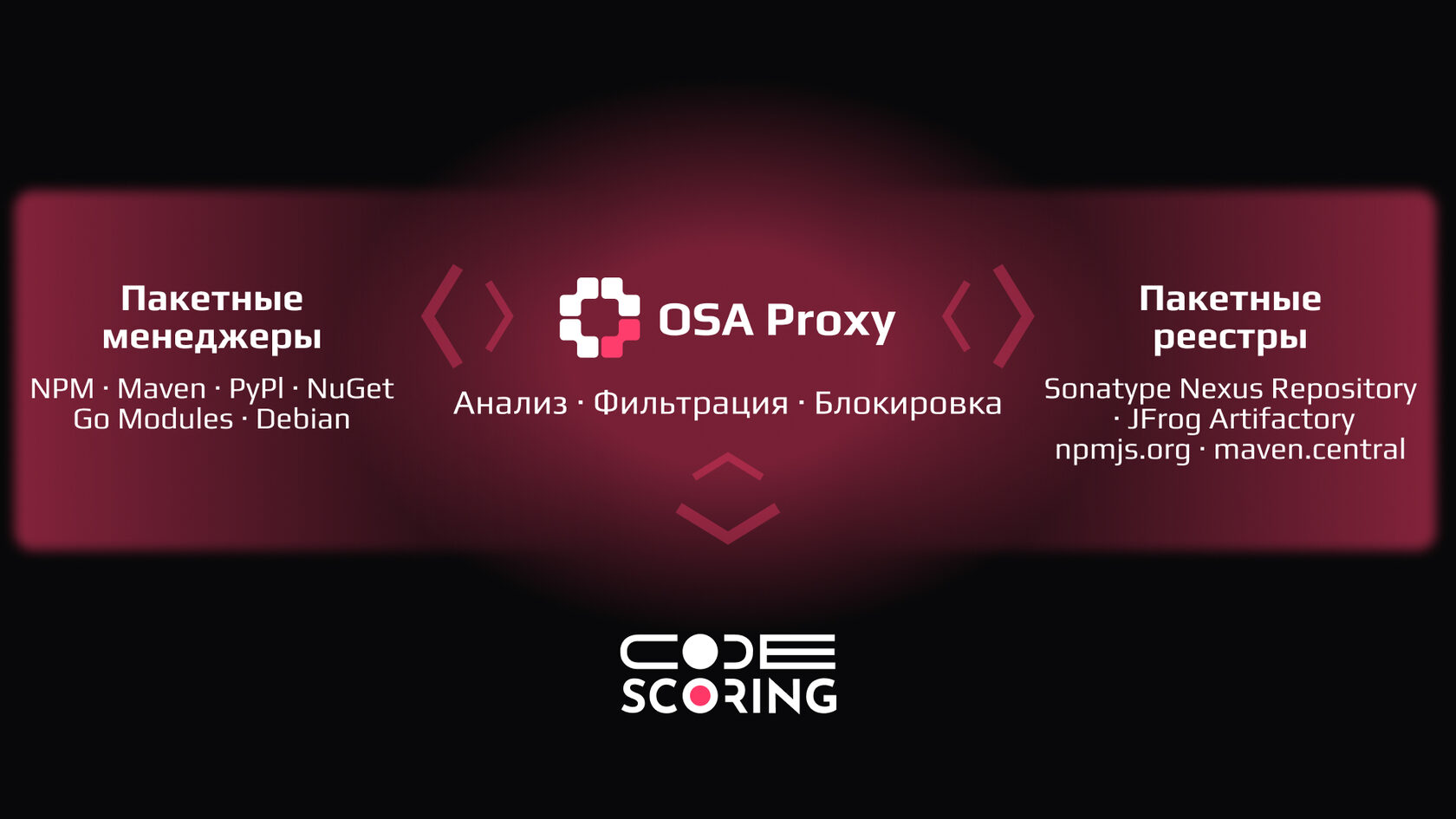 В модуле CodeScoring.OSA появился новый сервис – OSA Proxy. Он выступает посредником между пакетными менеджерами и их удалёнными репозиториями, автоматически проверяя пакеты и блокируя небезопасные версии в соответствии с политиками безопасности. Это позволяет внедрять модуль CodeScoring.OSA без привязки к хранилищам артефактов и гарантирует соблюдение требований безопасности при работе с внешними пакетными индексами.